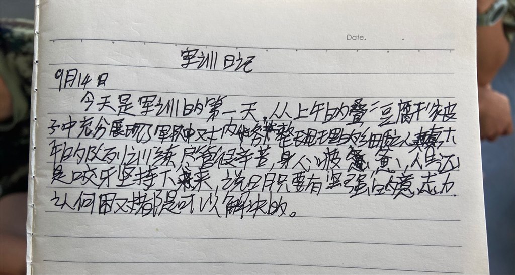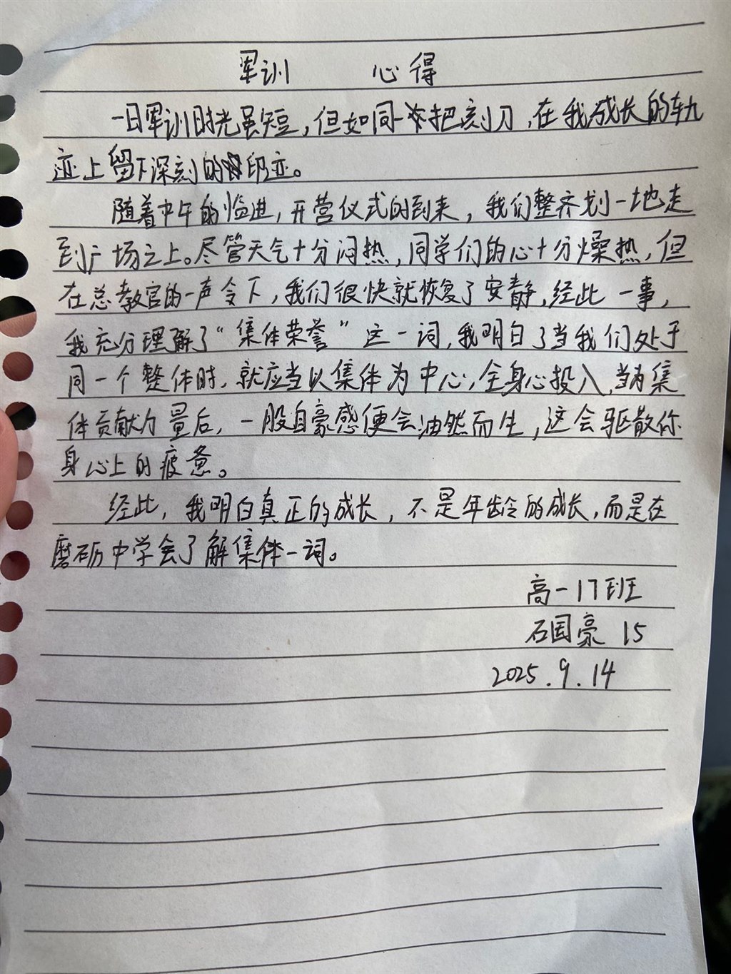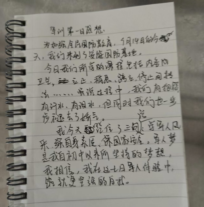 在一天的军训结束后,同学们纷纷利用休息时间写下了自己的感想与收获: