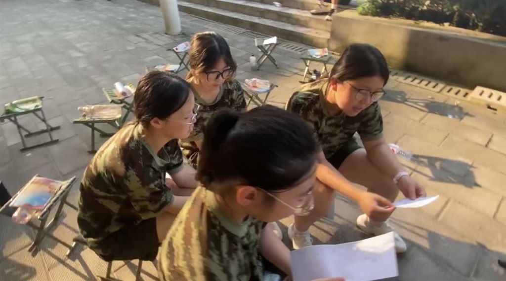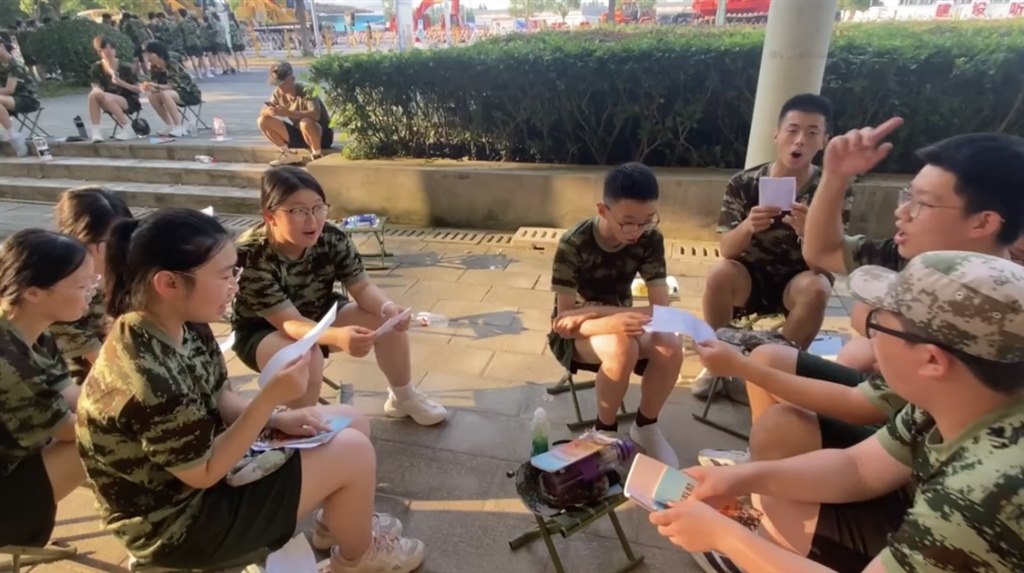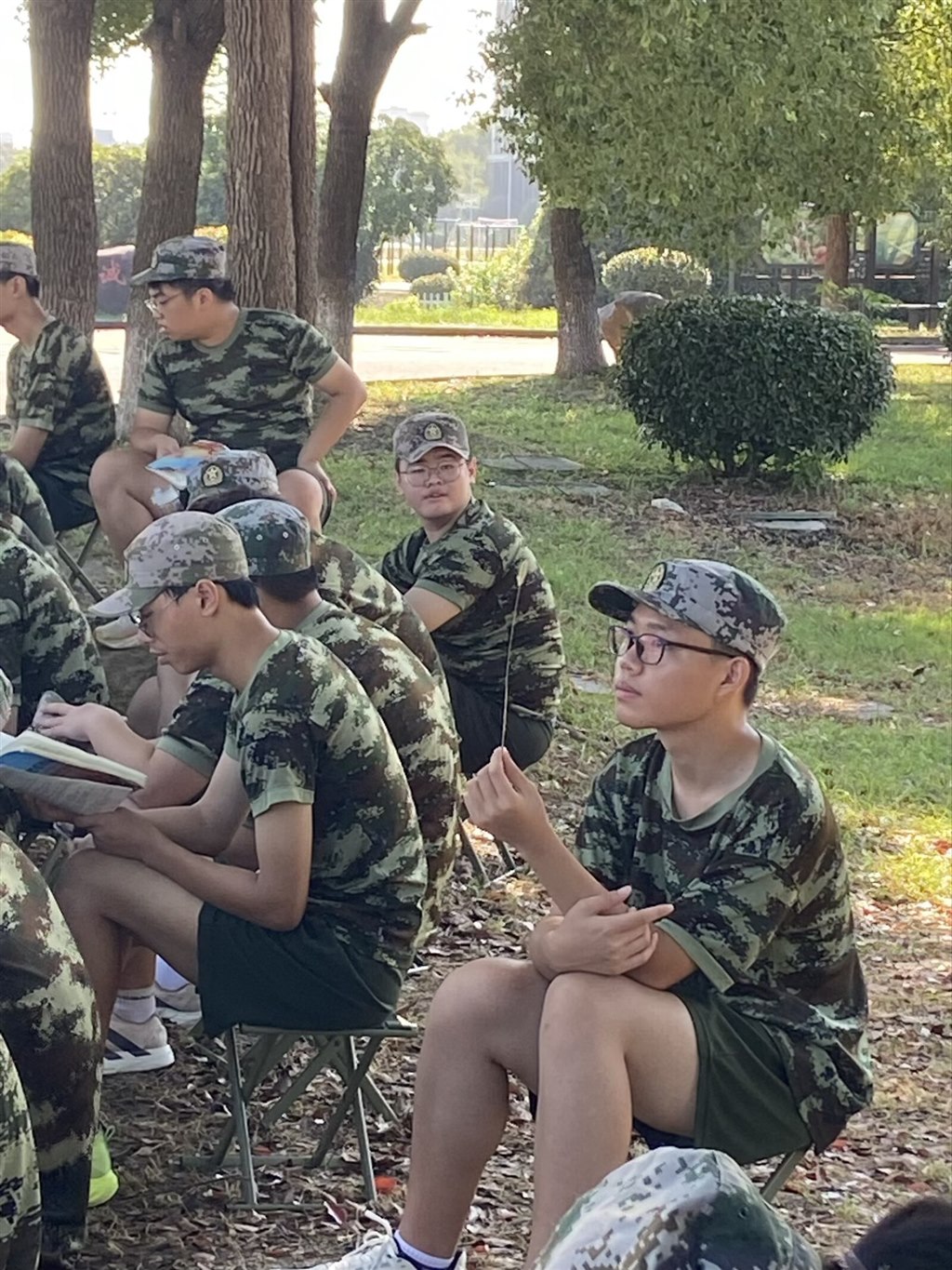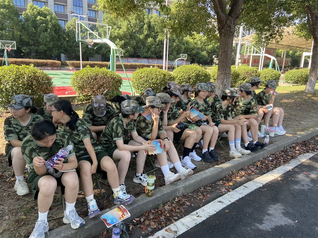 树荫下,数十个学生围坐,有同学正仔细阅读国防教育册子,目光中闪烁着对国之重器的好奇与憧憬,纸页上的文字正悄然将责任的种子播入心田。也有同学借着这片刻闲暇,分享着自己的见闻与趣事,水壶在彼此间传递,友谊的桥梁在只言片语中悄然架起。也有同学独自静坐,指尖捻着一根普通的苇草凝神细察,为自己开辟了一方宁静的思想天地。