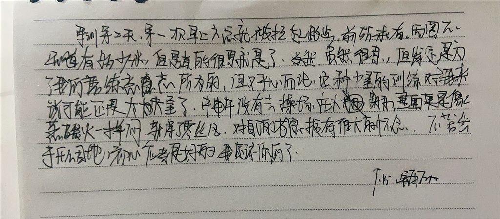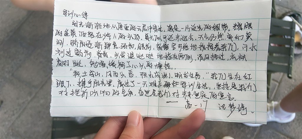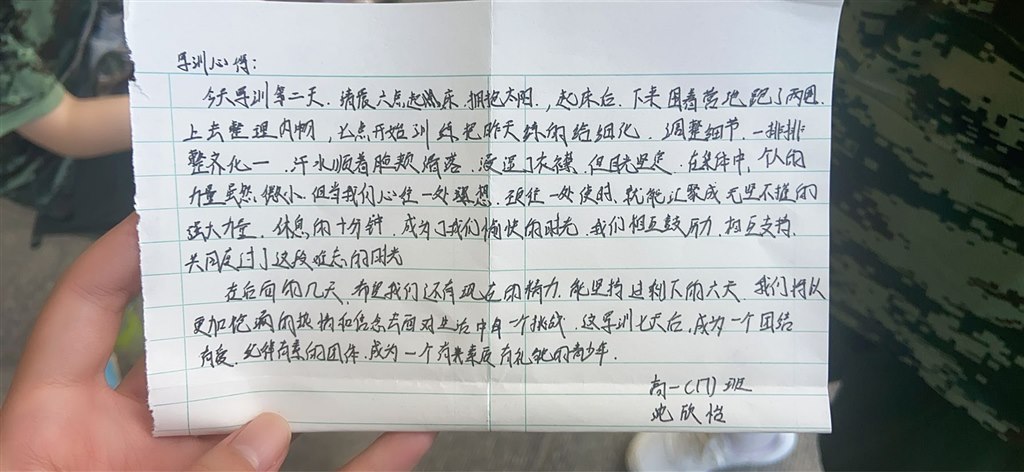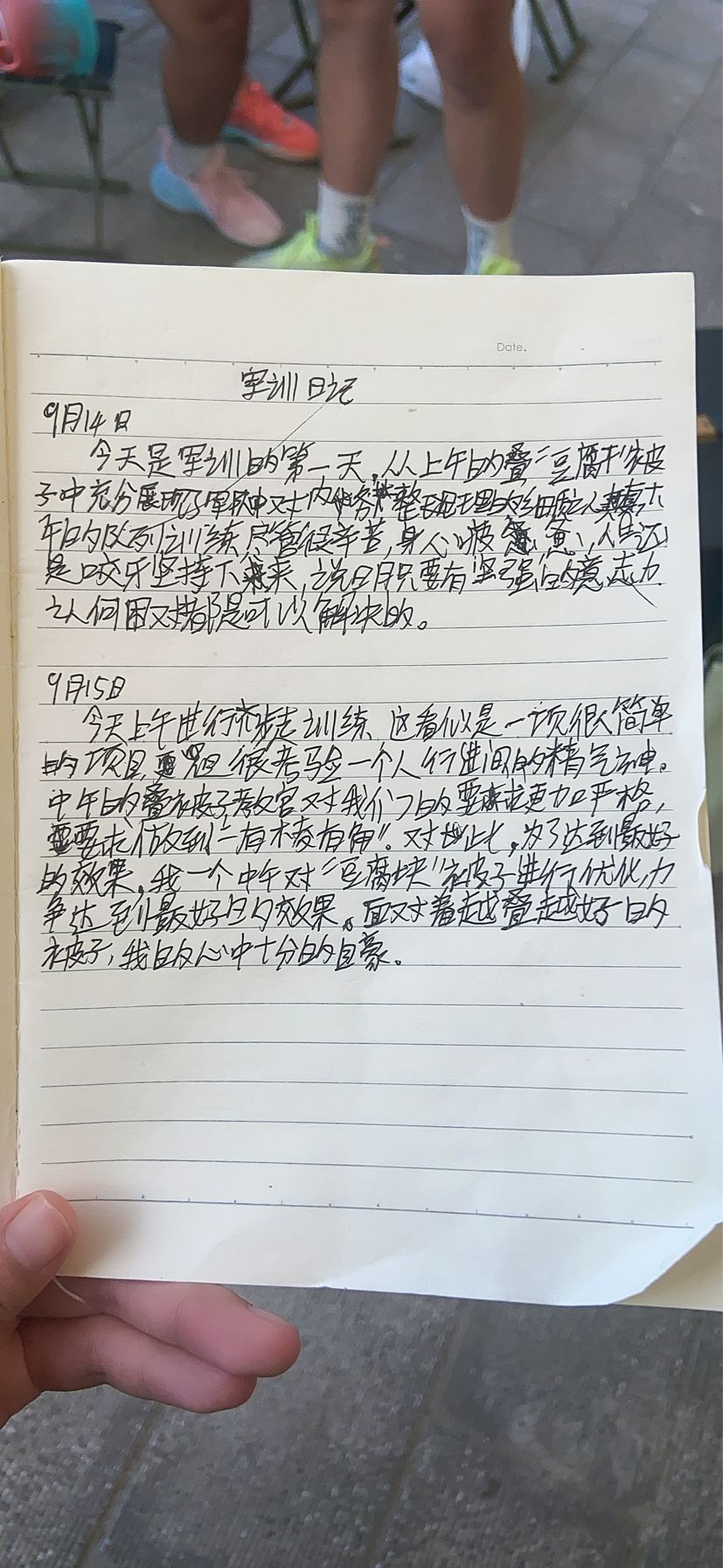 军训第二天,同学们记录下比首日更为丰富的成长体悟。既有夜深人静时对家的眷恋,也有迎着朝阳时对未来的憧憬,更在努力尝试中体会到了突破自我的自豪。“积土成山,风雨兴焉;积水成渊,蛟龙生焉”,有位同学引用了这样一句话,每一步枯燥的重复,都在为未来的风雨与腾跃埋下伏笔。