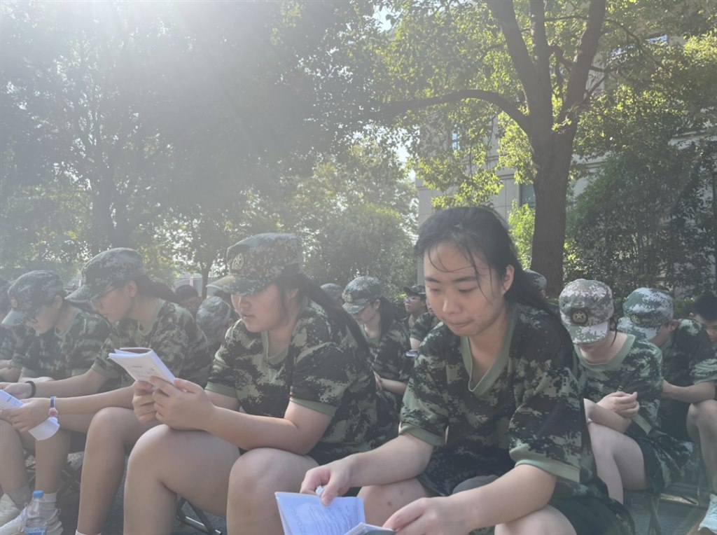刚卸下沉重的装备,休息的哨声还没散尽,有人就掏出歌词纸,你一句我一句跟着哼唱 —— 这没有严格口令的合唱,是军训间隙里最轻松的时光,把训练的疲惫都融进了轻快的调子。