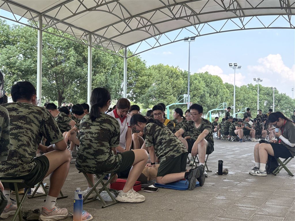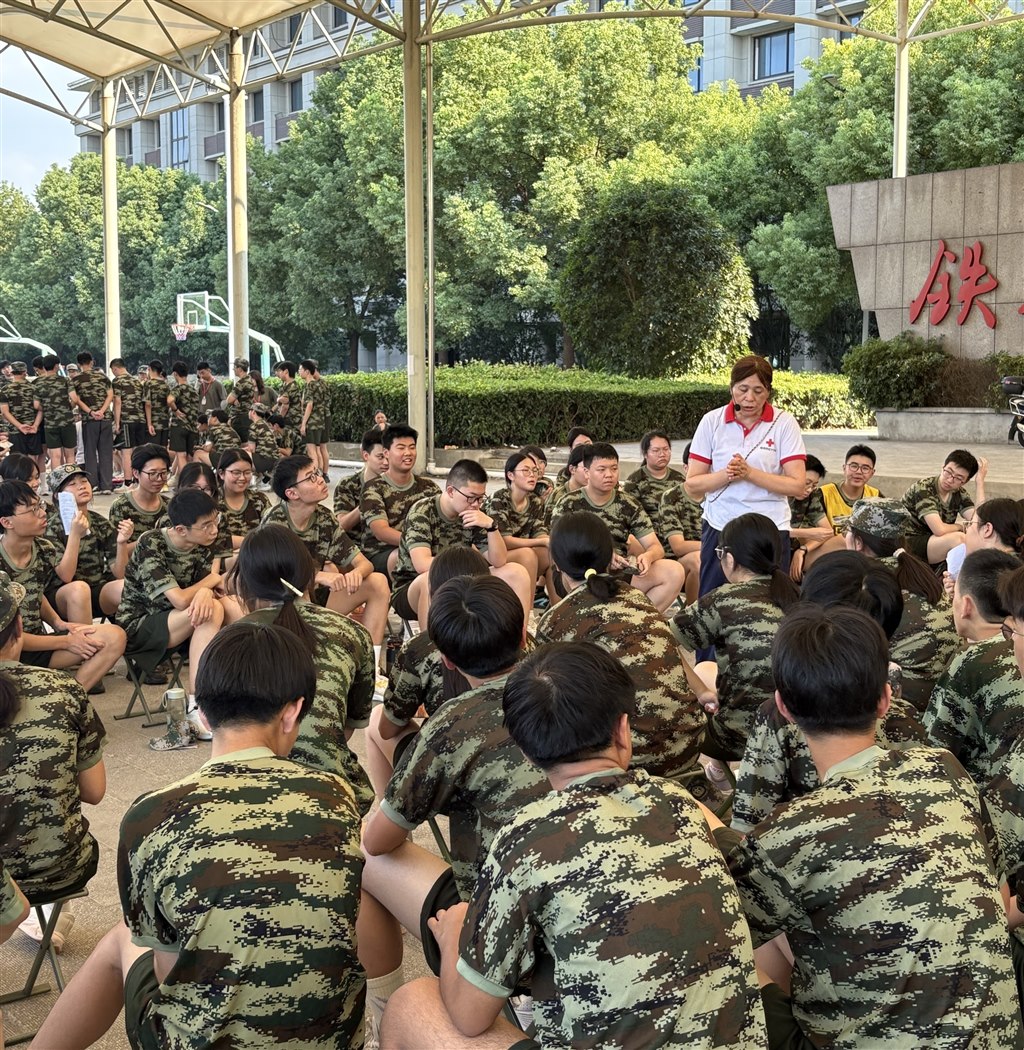 军训第三日下午,一片迷彩绿的训练场上,跃动着一抹温暖的红。红十字会来军训场地进行应急救护培训,学生们俯身练习,指尖传递着敬畏与担当。橄榄绿的坚韧,融汇红十字的仁心,铸成青春最动人的信念——守护生命,是比任何考核都重要的勋章。