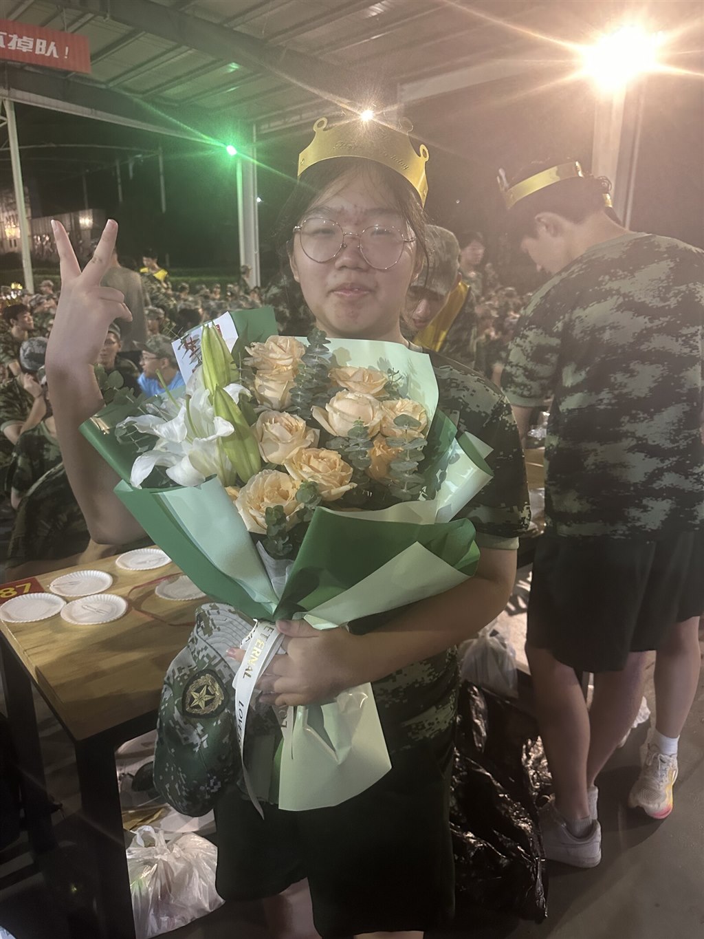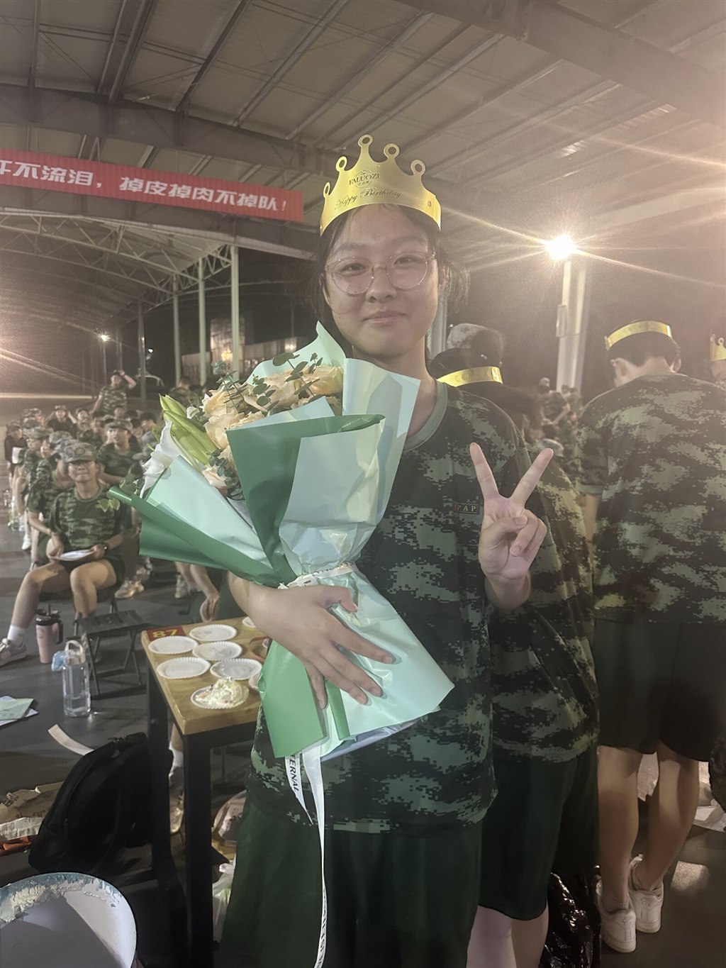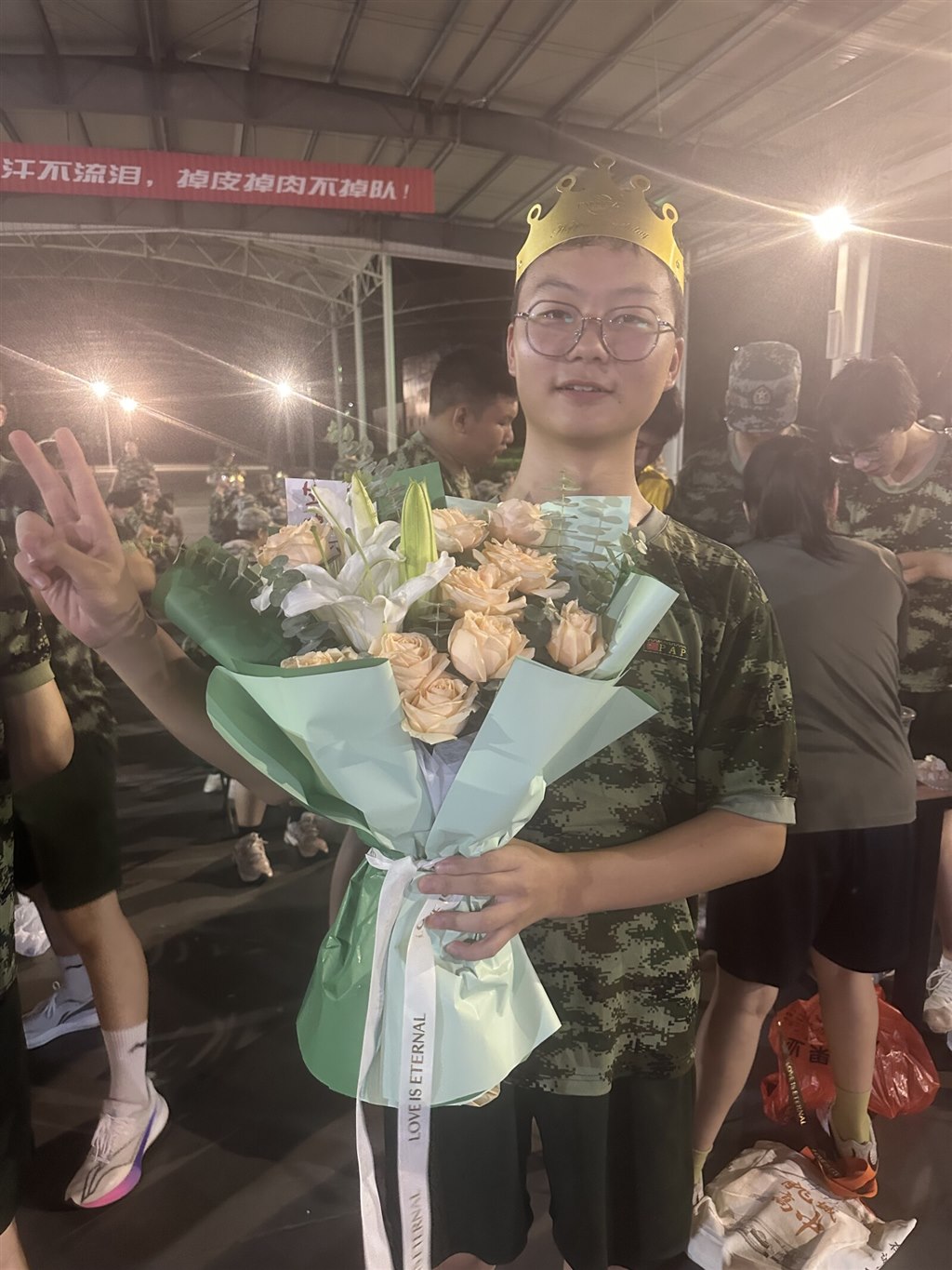 夜色笼罩训练场时,金色的皇冠突然在迷彩队伍里亮起来。我们围着戴皇冠的伙伴,有人比出 “V” 字手,有人笑着望过来,训练一天的疲惫,好像被这突如其来的生日惊喜瞬间冲散了。