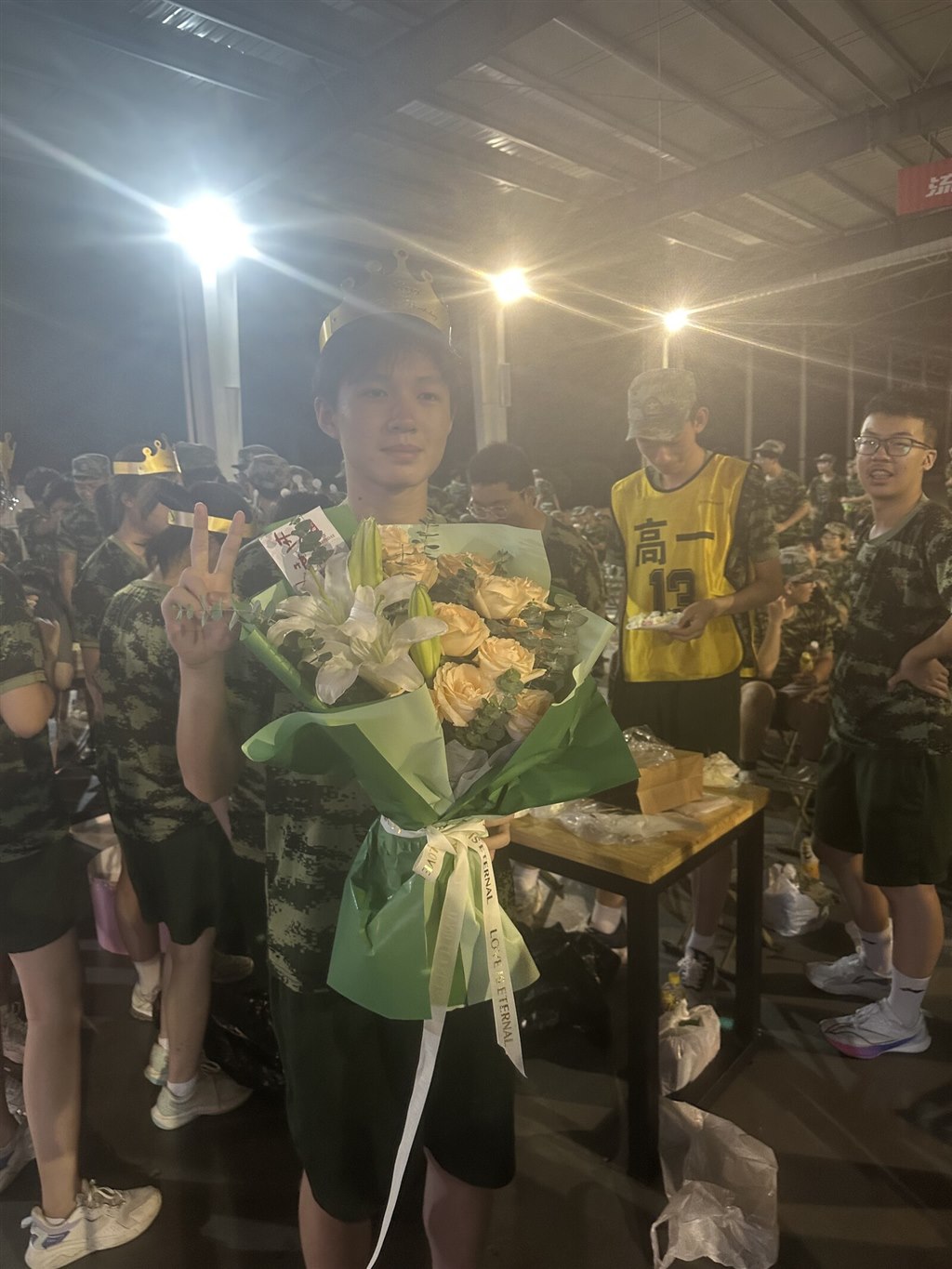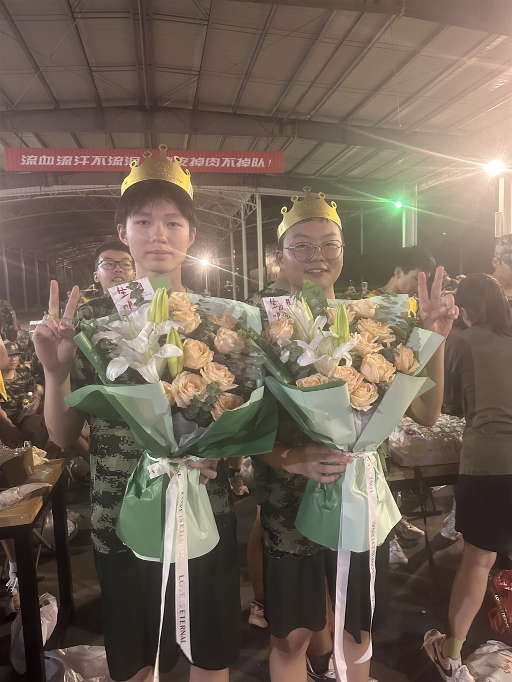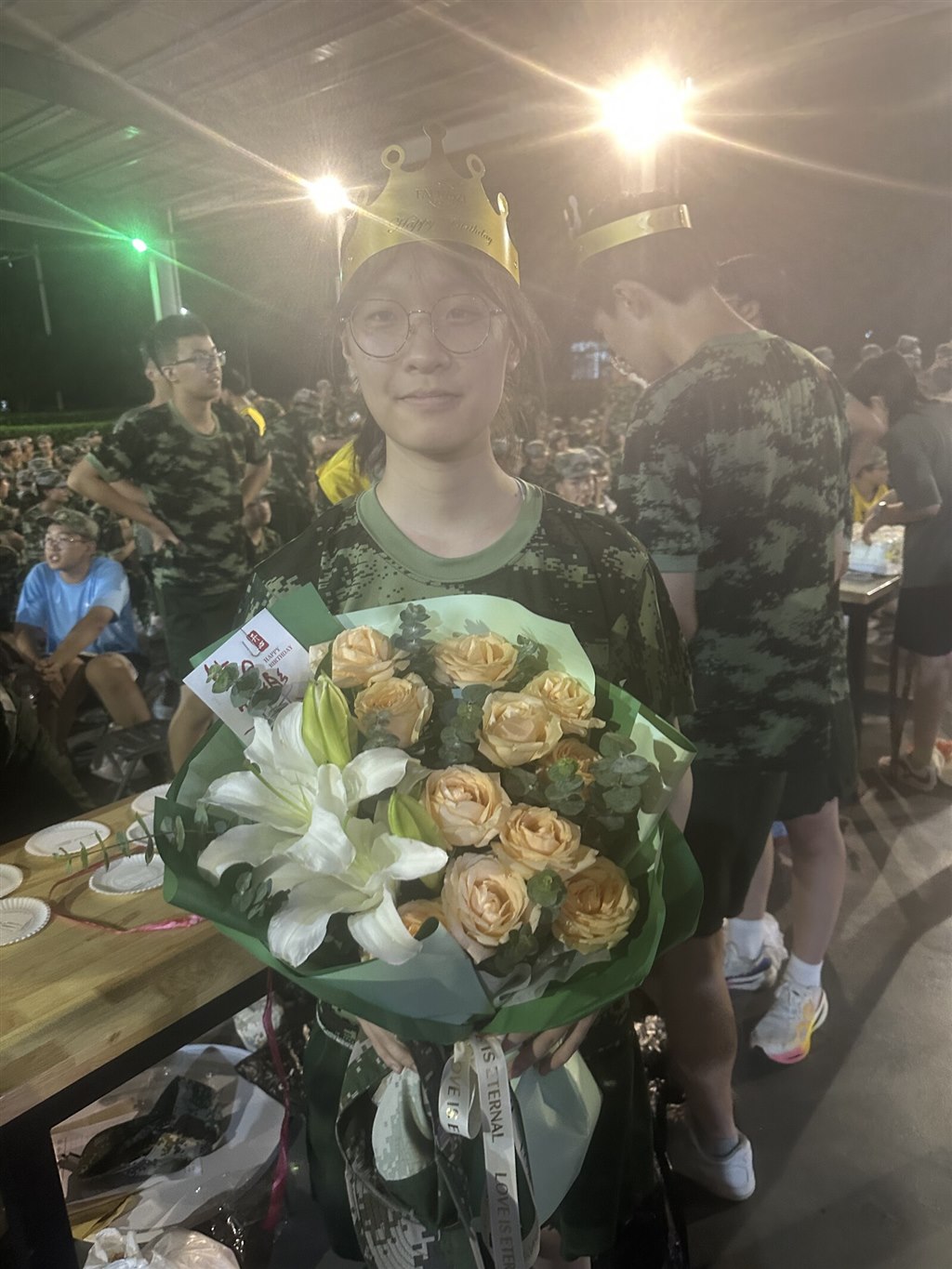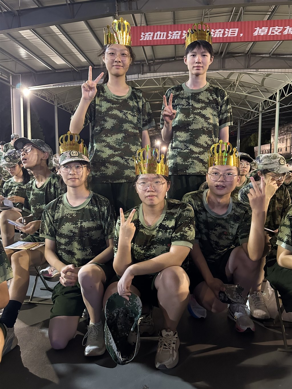 夜色笼罩训练场时,金色的皇冠突然在迷彩队伍里亮起来。我们围着戴皇冠的伙伴,有人比出 “V” 字手,有人笑着望过来,训练一天的疲惫,好像被这突如其来的生日惊喜瞬间冲散了。